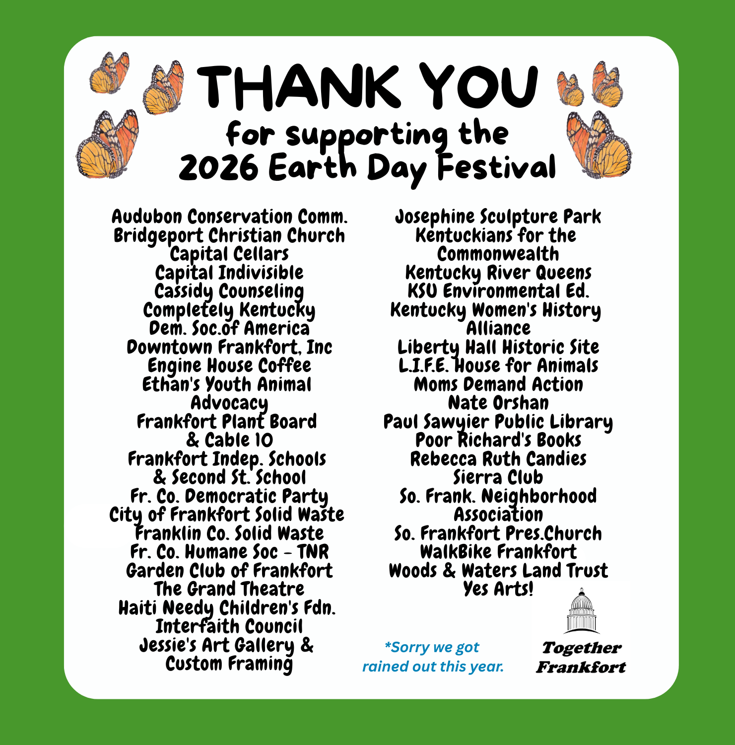 Earth Day Festival 2026 was rained out, but we are deeply grateful to ALL the individuals and organizations who put countless hours into planning and preparing for the celebration.
