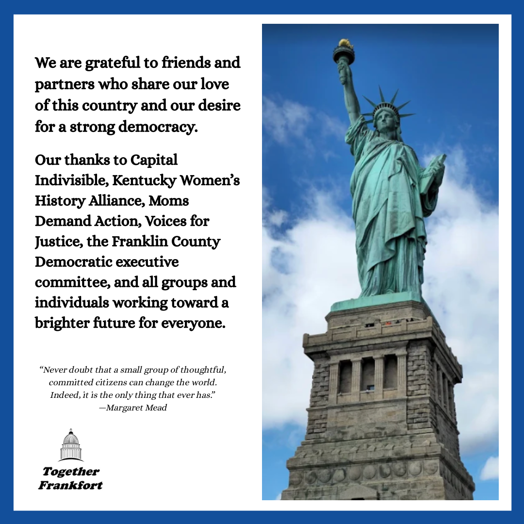 Join Together Frankfort in voter registration events, forums on important issues, environmental events and lots of other activities that help make Frankfort and Franklin County stronger. Members help us achieve our goals, including to: